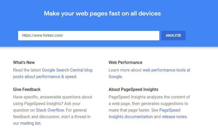 It has a bar to enter a URL, and then it’ll take 1-2 minutes to analyze and check your website.