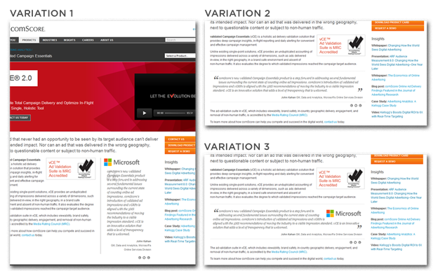 Comscore, a US-based media measurement and analytics company, experimented with customer testimonials on their homepage. As a result, their vertically-aligned testimonial (variation 1), with the brand logo prominent at the top, increased their conversion rate by 69%!